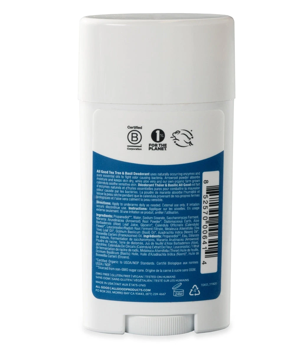Freshen up with All Good Tea Tree & Basil Deodorant, a natural and effective way to protect yourself from odor causing bacteria. Made with organic arrowroot powder to absorb moisture and dry underarms, as well as aloe vera and homegrown calendula to soothe sensitive skin, this all-natural deodorant will keep you smelling and feeling fresh with zero harm to your body.