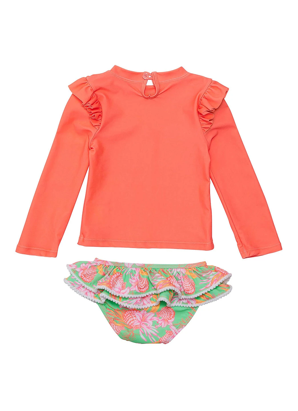 Brighten up beach days with this super cute rash guard top and bikini bottoms set, featuring a neon coral top with playful shoulder frills and mint shell-printed bikini bottom enhanced with double-layered ruffles and white pompoms. It’s a vibrant and fun choice for enjoying the sun, surf, and sand.