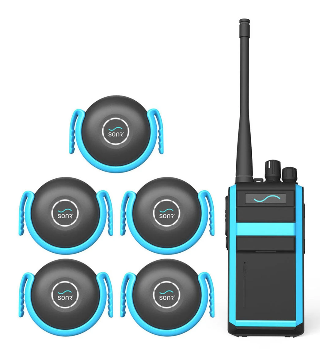 Basic team set consisting of 5 receivers and a radio transmitter. Talk with up to 5 swimmers simultaneously.