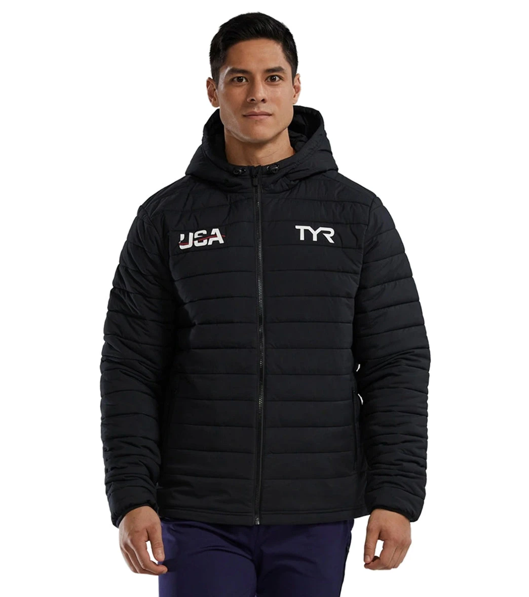 The TYR Men’s USA Hydrosphere Mission Puffer Jacket features Hydrosphere® technology and an adjustable hood, providing superior water repellency and wind resistance.